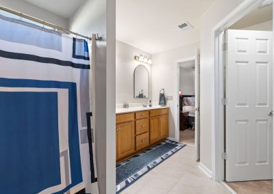 The primary bedrooms is a very comfortable size, and separate from the two guest bedrooms. The back yard is quite private, buffered by a wooded area. You can entertain until your heart’s delight on this huge added patio too!